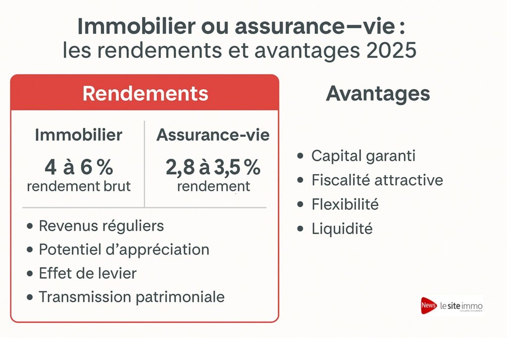 L’immobilier locatif reste plus rentable à long terme (4 à 6 %), mais l’assurance-vie offre un meilleur équilibre sécurité/liquidité (2,8 à 3,5 %).