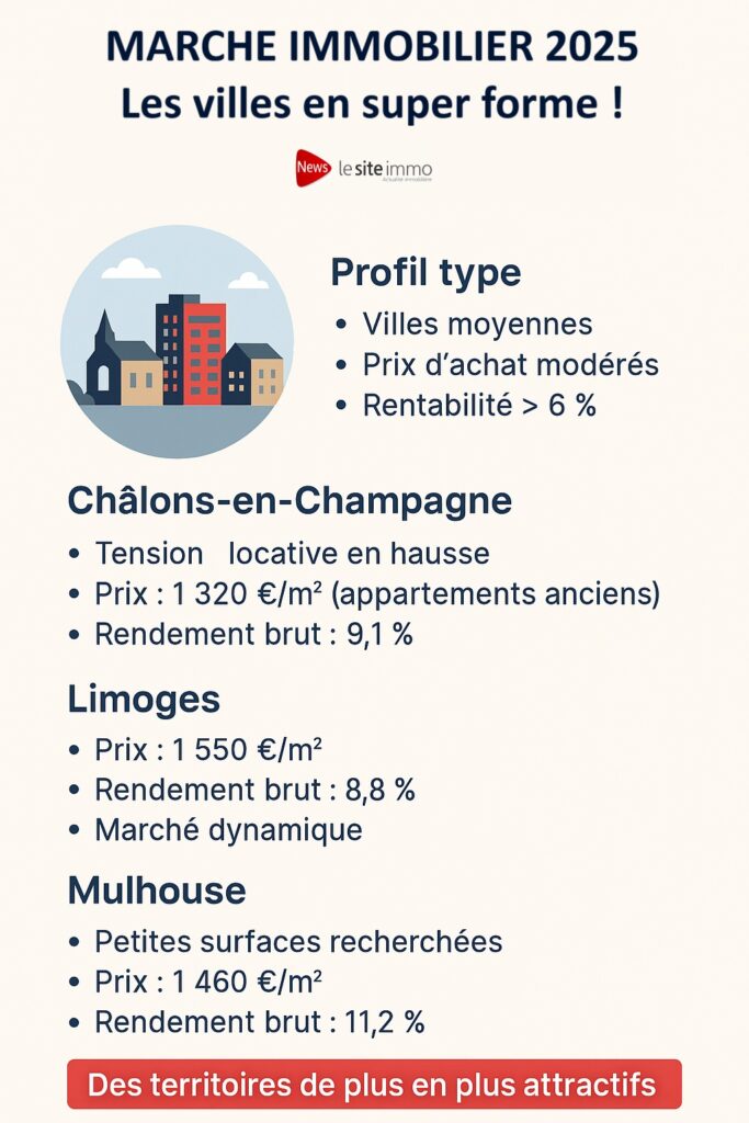À Châlons-en-Champagne, par exemple, les chiffres parlent d’eux-mêmes : un rendement brut de 9,1 % pour un T2 de 40 m² et une tension locative en hausse de plus de 8 % sur deux ans. À Limoges, la formule est différente mais tout aussi efficace : un prix moyen autour de 1 550 €/m² et une rentabilité brute proche de 9 %. Quant à Mulhouse, la ville d’Alsace s’impose comme la surprise de l’année avec des rendements qui dépassent 11 % pour les petites surfaces. Trois profils différents, une même constante : la rentabilité.