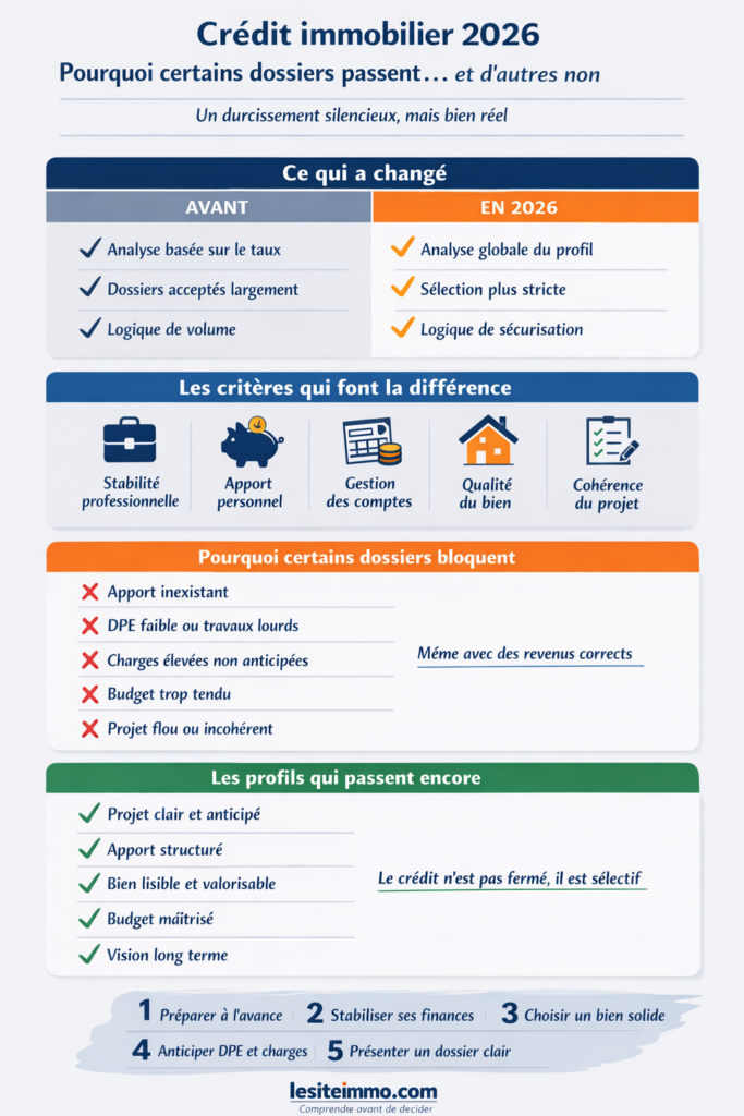 Les banques cherchent moins à produire du volume qu’à sécuriser leurs encours. En 2026, un dossier moyen n’est plus automatiquement accepté. Il doit être lisible, cohérent et rassurant sur le long terme.