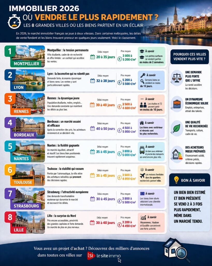 En 2026, la rapidité de vente dépend avant tout du positionnement du bien. Dans les grandes villes dynamiques, les acheteurs sont présents mais exigeants. Un bien au bon prix, bien présenté et bien situé peut encore se vendre très rapidement, tandis qu’un bien surévalué sera immédiatement pénalisé.